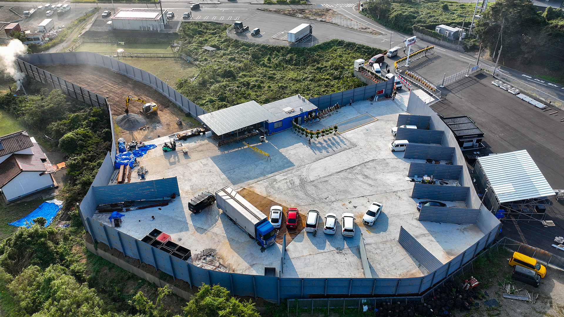 リサイクル会社の新施設完成および開業にあわせて撮影したドローン空撮写真です。上空から施設全体を捉えることで、敷地の広がりや設備配置、動線を視覚的に分かりやすく表現しています。