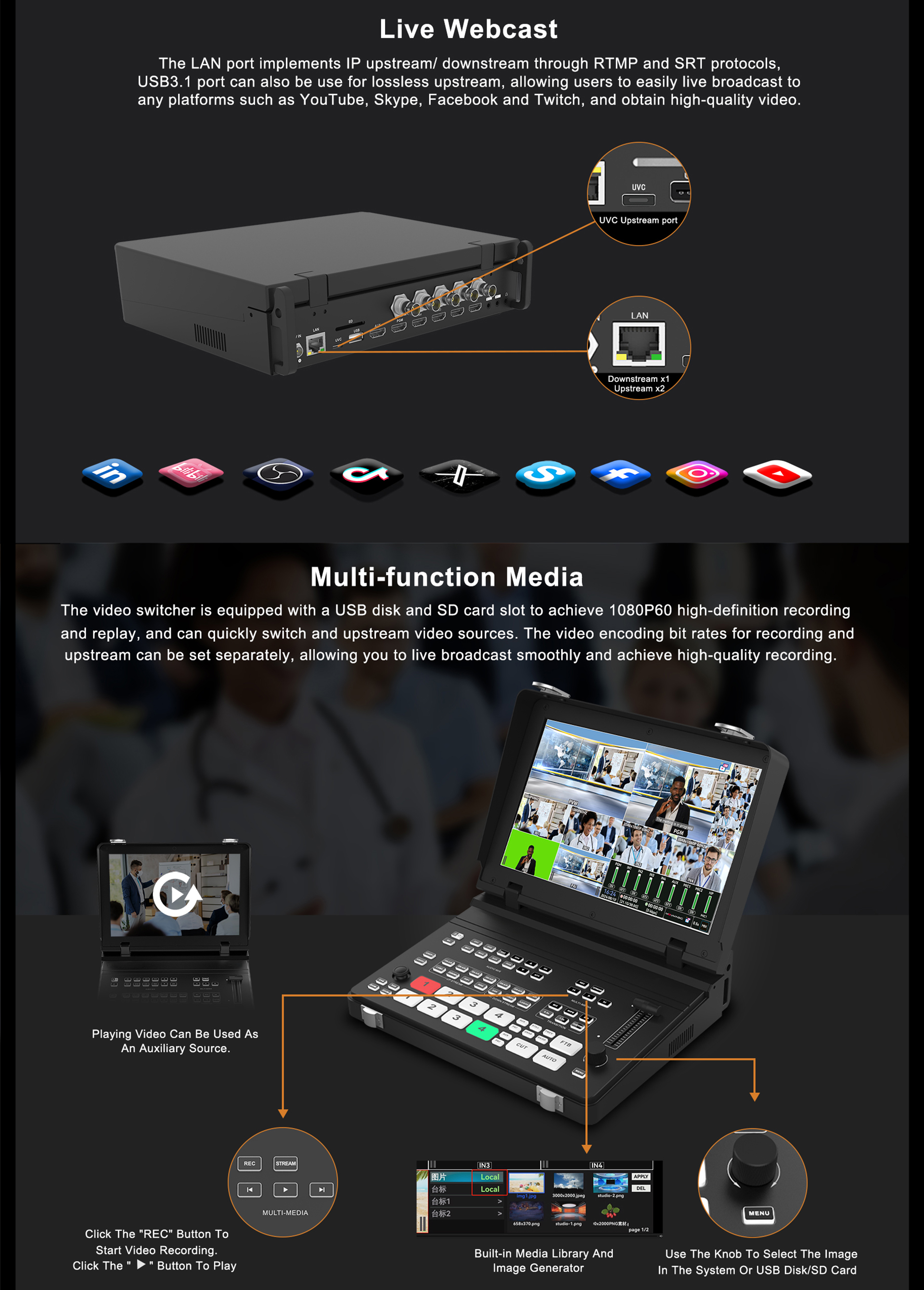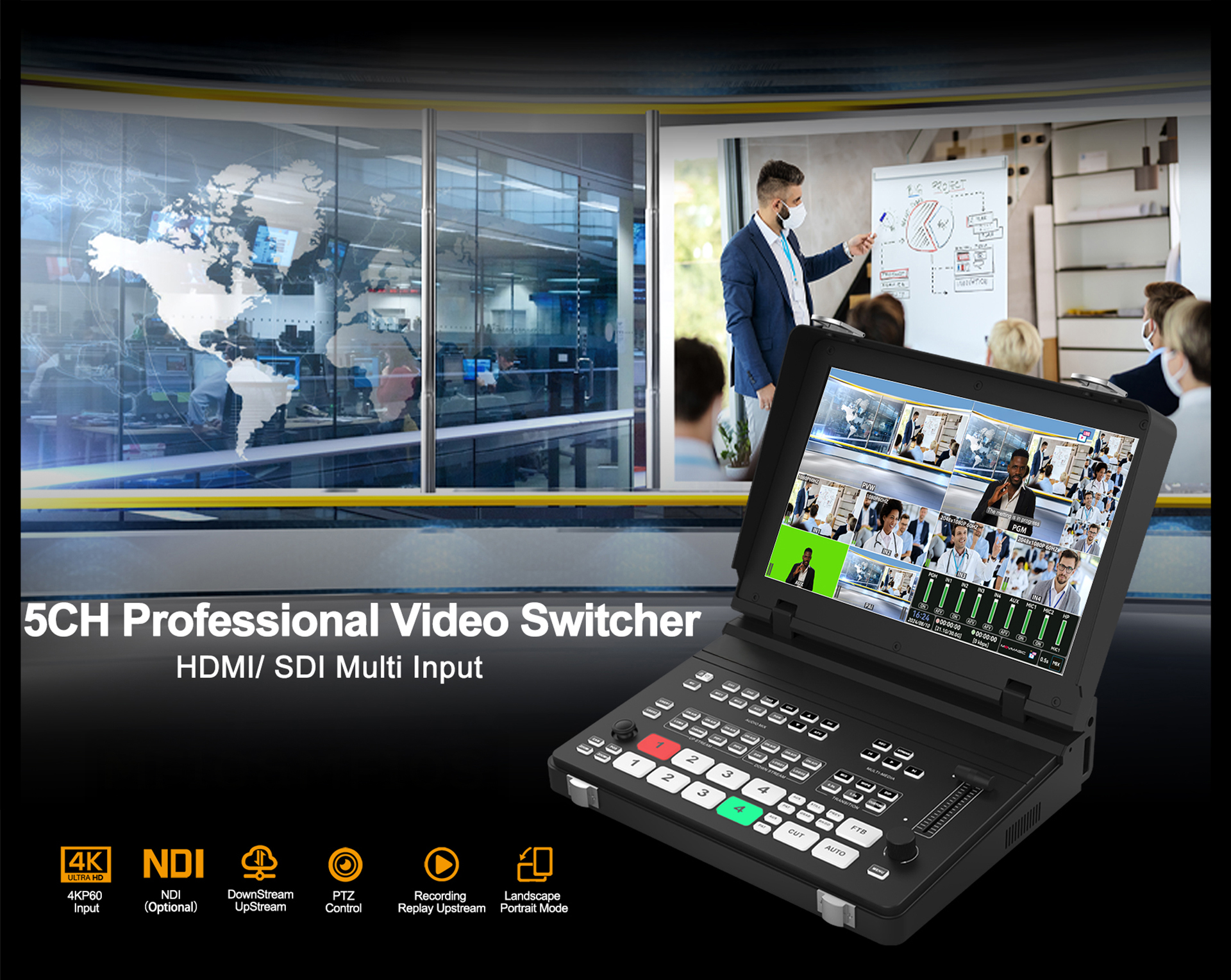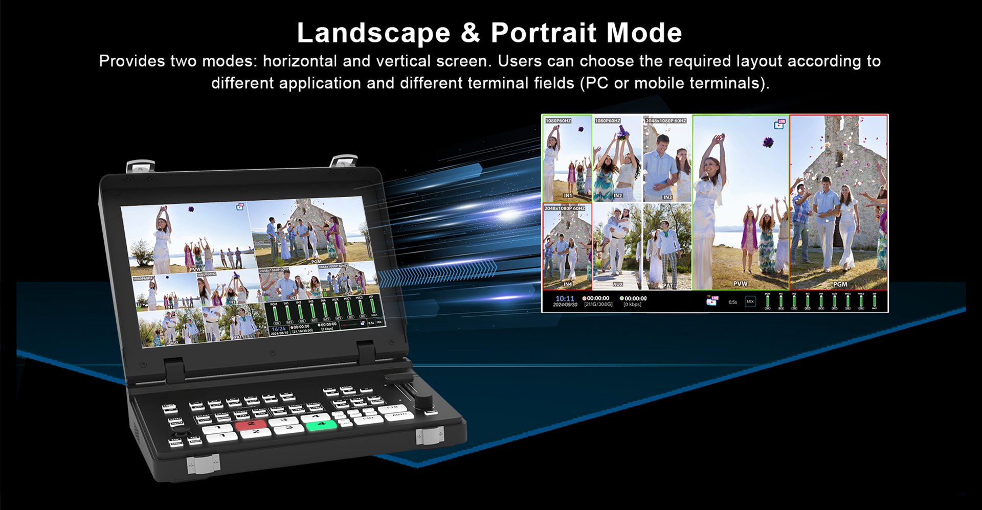 ● 横画面・縦画面の柔軟な切り替えに対応、縦画面アップストリームも可能