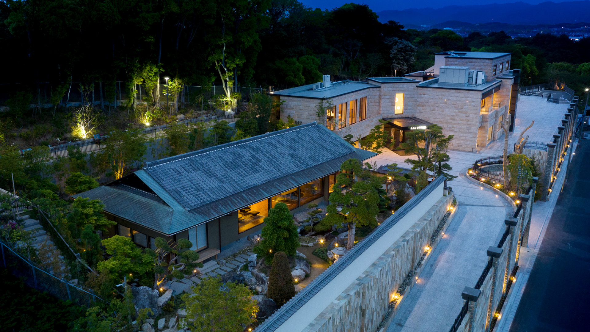 撮影は、夕暮れ時に建物の灯りが美しく映える時間帯を選定し、昼と夜が交差する印象的な雰囲気を演出しました。建築のデザイン性と上質な空間イメージを、立体的かつ直感的に伝える空撮ならではの表現です。